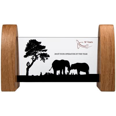 UK manufactured real wood block awards with recycled clear acrylic fronts. Constructed in a range of responsibly sourced 28mm thick Oak. . Available in a range of 8 standard shapes; Oblong, Arch, Sail, Spinnaker, Wedge, Swell, Wave, Flame and all feature a hand applied satin wax oil finish. Full colour print to the front face of the wood or acrylic as required. Every sustainable material award sold contributes one tree in our Tree Planting Scheme.