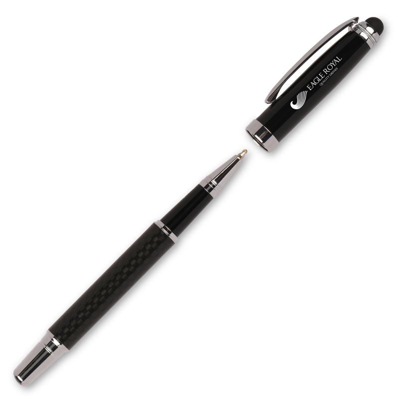 A high quality rollerball pen with a high grade carbon fibre barrel. Features a stylus that is perfect for using on touch screen devices. The barrel can be printed, whilst the cap can be engraved to show a mirror-chrome finish.