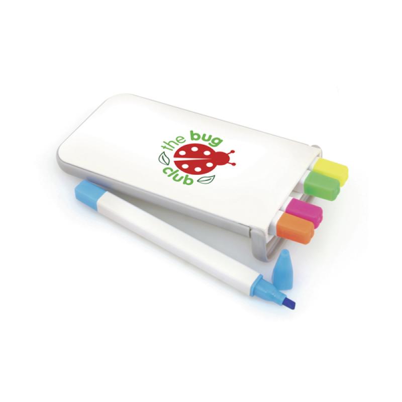 Plastic rectangular cased 5 piece highlighter set with amber, pink, blue, green and yellow coloured highlighters. A compact and slim line way to store your highlighters and will easily fit in a laptop bag or conference folder.